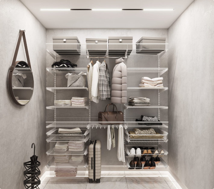 Скомпоновать нужные элементы и посмотреть, как будет выглядеть помещение, можно в удобном онлайн-конструкторе. Или заказать создание модульной системы дизайнерам компании: они спроектируют комфортное пространство гардеробной с учетом всех ваших пожеланий.